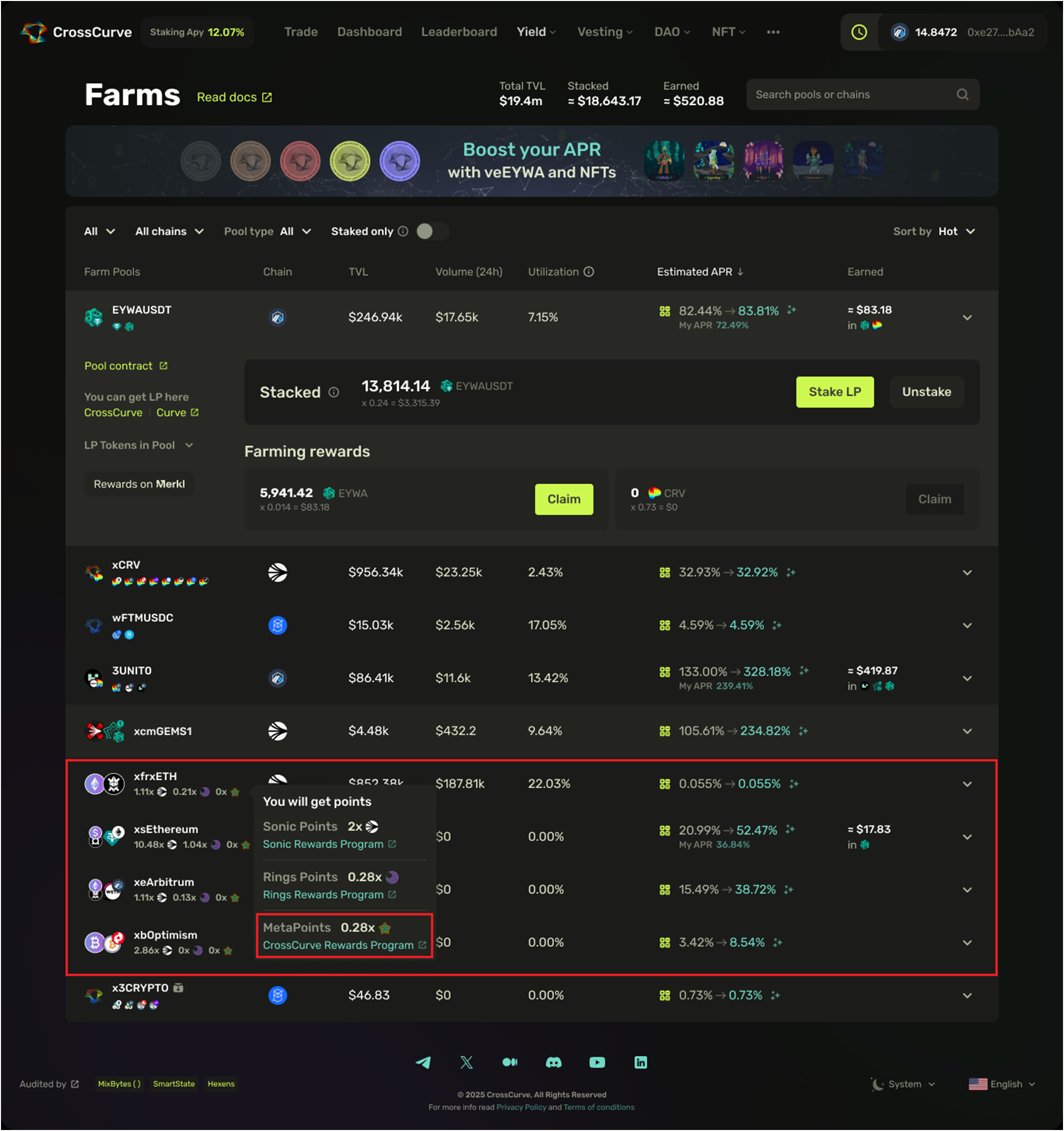 * Users who provide liquidity to participating pools<mark style="color:red;">**\***</mark> in the **Farms** tab by staking LP tokens in the CrossCurve app
