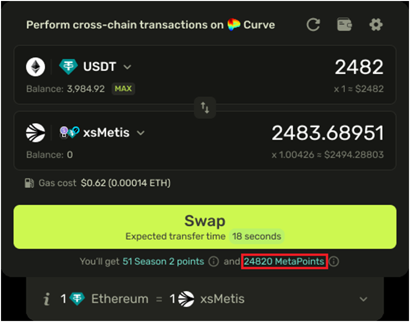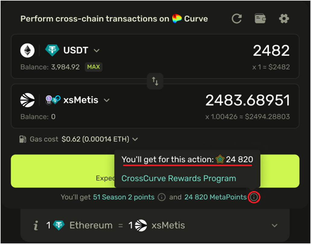 * In the “**Trade**” interface, the expected point value of the swap will be reflected alongside points from [**Season 2 of Sonic’s airdrop**](https://docs.crosscurve.fi/user-documentation/migration-to-sonic/sonic-incentives-on-crosscurve-metalayer#season-2).