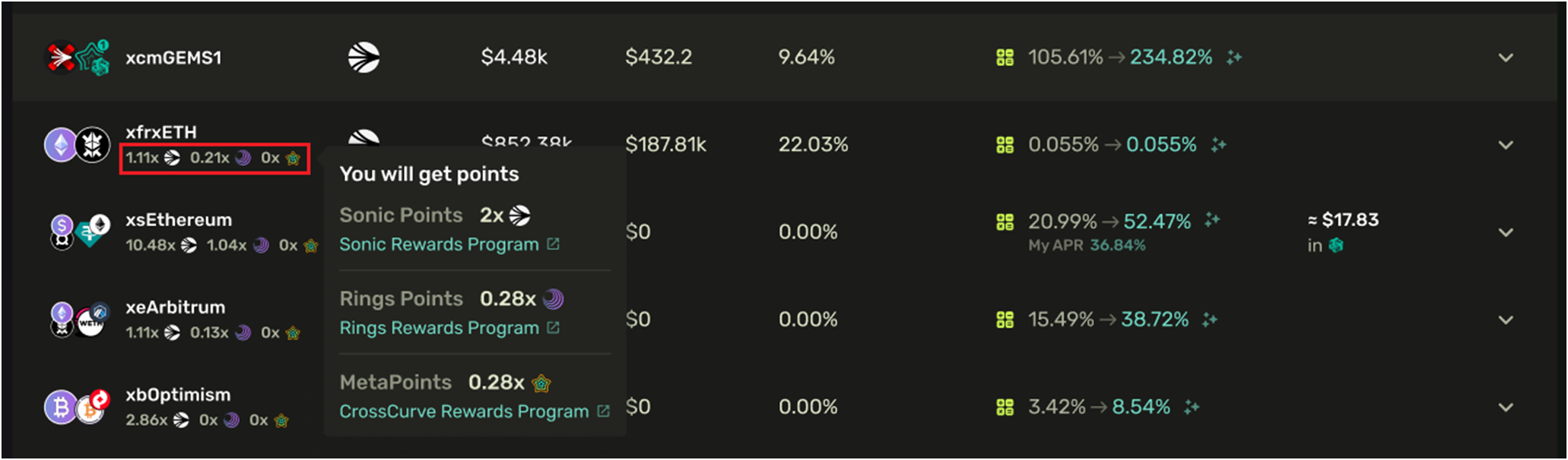 * Points accrue **only for the volume of** [**s-tokens**](https://docs.crosscurve.fi/user-documentation/migration-to-sonic/liquidity-transfer-from-fantom-to-sonic#providing-liquidity-to-pools-on-sonic) in the LP: