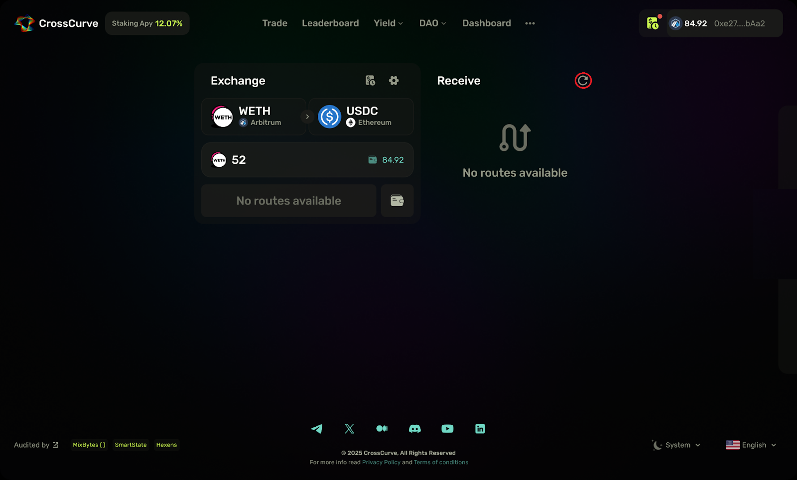 **Step 9.** If the aggregator returns the **No routes available** result, try to refresh, change the swap amount, select another token pair, or retry this swap at a later time.