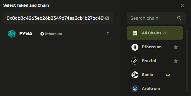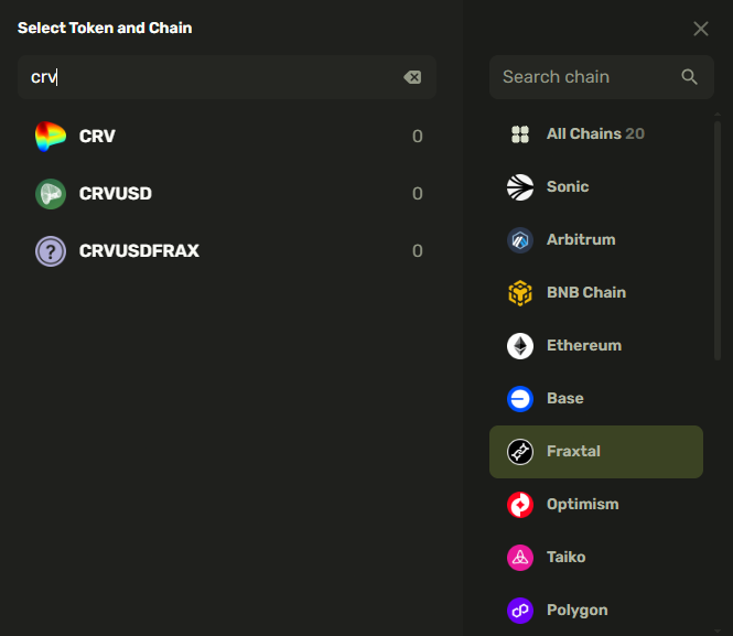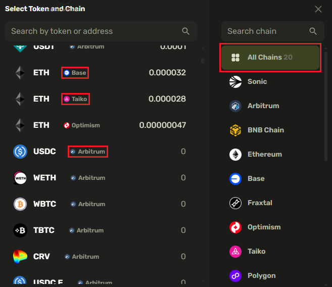 If you select **All Chains**, search will sort the tokens available in your wallet to appear at the top of search results based on the balance amount. Below them, you will see the tokens supported by the **CrossCurve aggregator** in alphabetical order.&#x20;