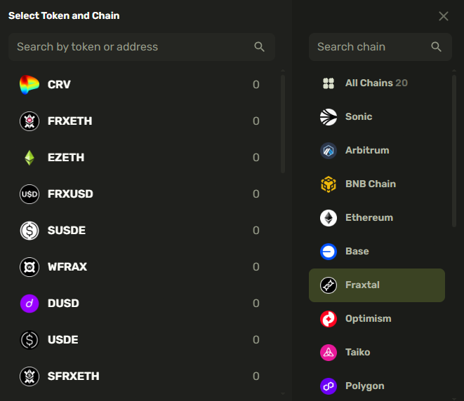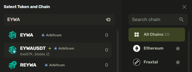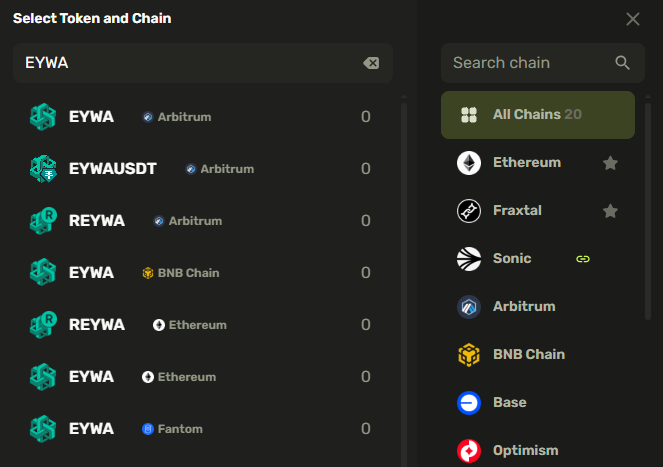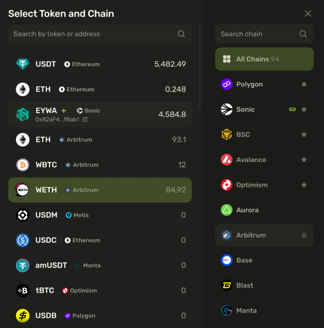 #### Modal window for selecting chains and tokens