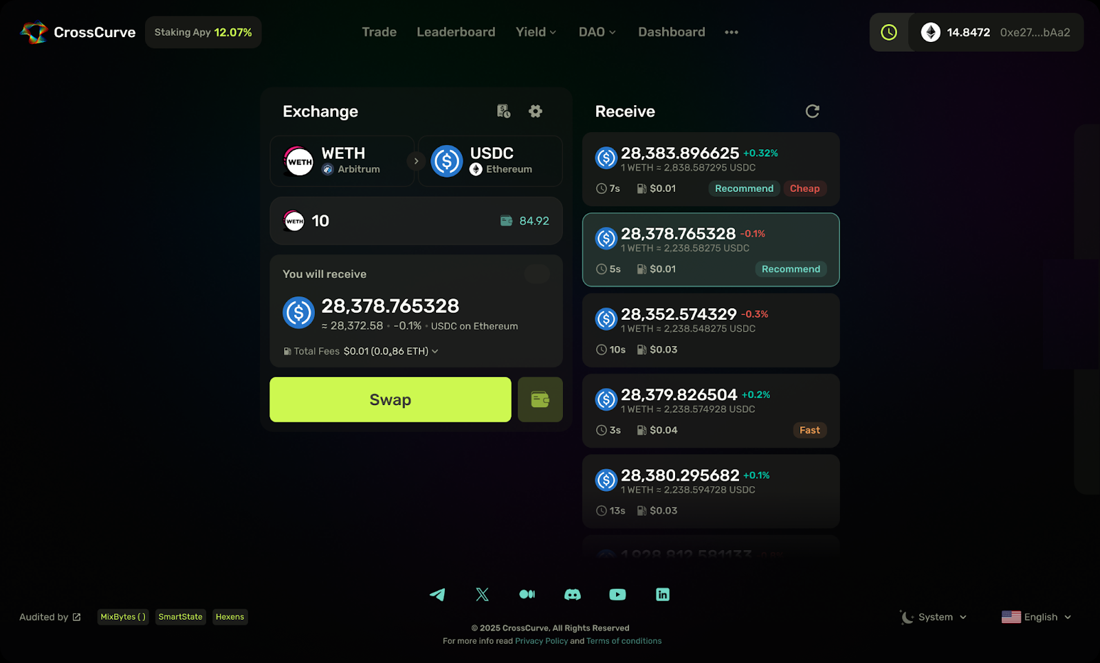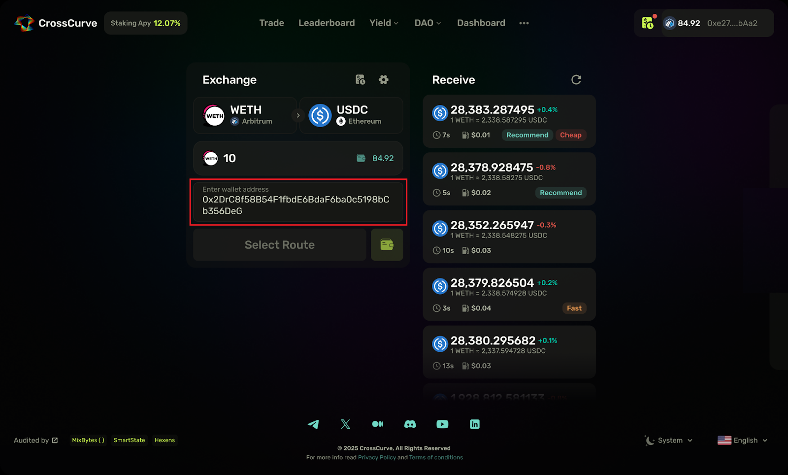 **Step 7.** After entering the total swap amount, the **CrossCurve aggregator** will show you all the available routes in the Receive field, along with the amount you’re expected to receive, transaction duration, and gas costs.
