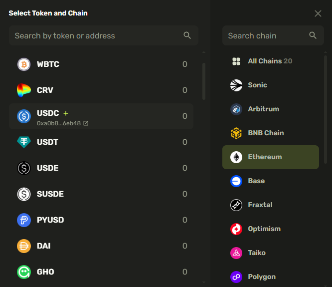 A modal window is used for selecting chains and tokens:
