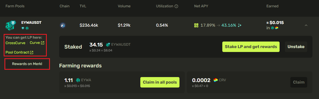 **Staked** shows the balance of LP tokens locked for earning EYWA and CRV.