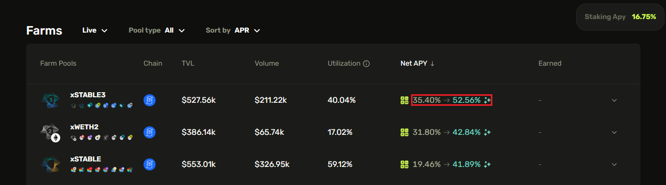* **CRV cAPR** - “CRV vAPR” is distributed separately and can be claimed on the “**Farms**” page in the “**Farming rewards**” section. The amount of this yield depends on your **veCRV boost**.